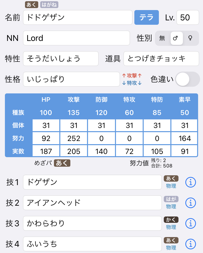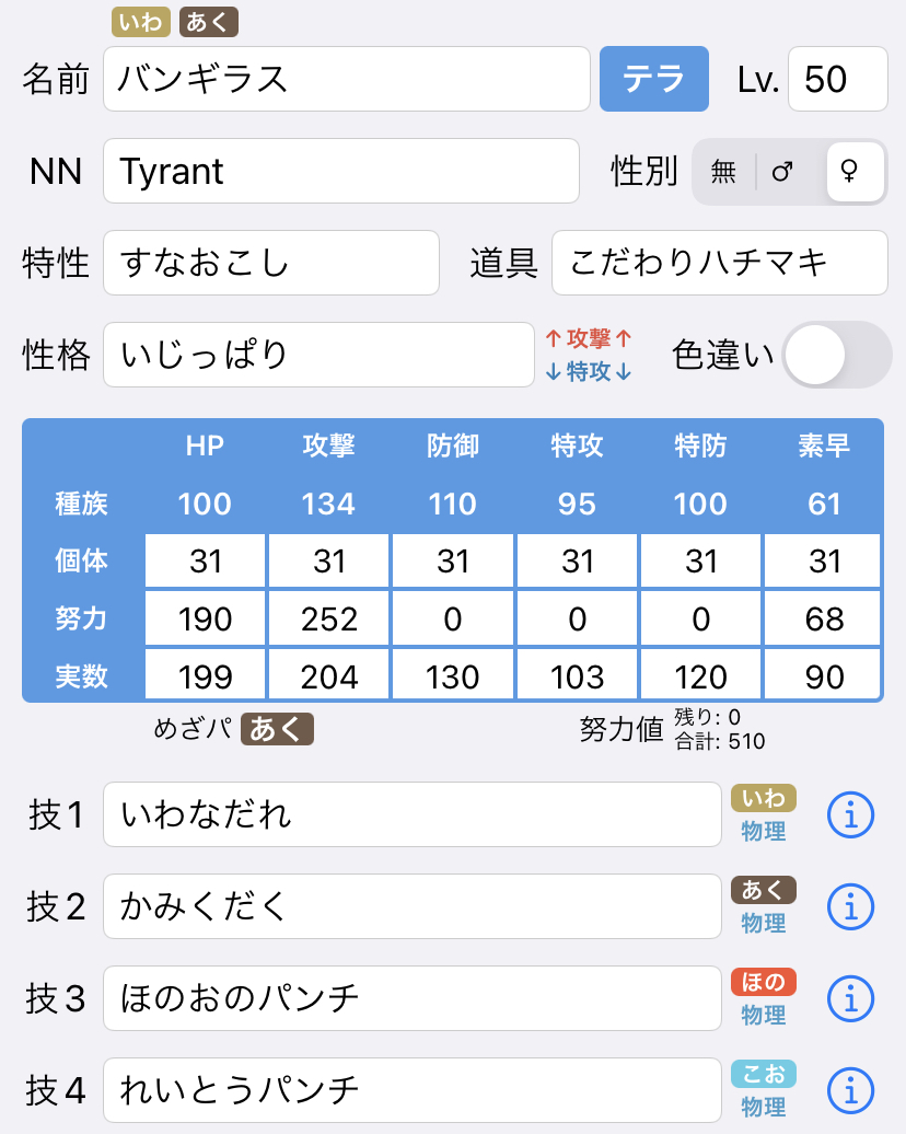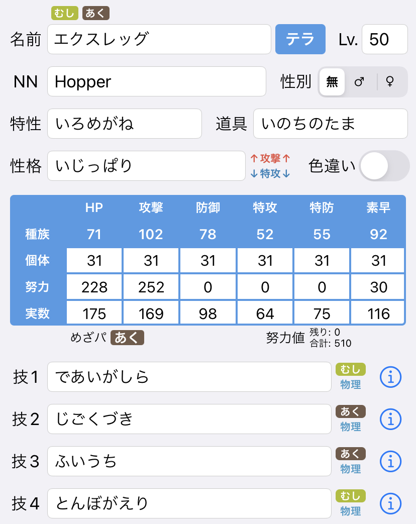 色眼鏡+悪技の相性が非常に良く、半減相手がほぼ存在しないため負荷をかけやすい点が優秀でした。